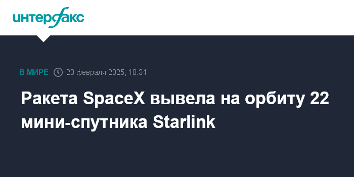 Москва. 23 февраля. INTERFAX.RU - Ракета-носитель Falcon 9 в воскресенье по московскому времени успешно вывела на орбиту партию из 22 мини-спутников для пополнения орбитальной группировки глобальной сети интернет-покрытия системы Starlink, сообщила компания-разработчик SpaceX.