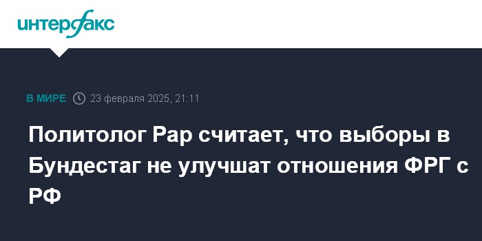 "На данный момент можно констатировать, что будущим канцлером станет Мерц (Фридрих Мерц, лидер христианских демократов - ИФ), а Шольц уйдет в отставку. Править ХДС/ХСС может только с СДПГ, но даже этого может не хватить, и тогда Мерцу придется создавать "тройственный союз", и кроме социал-демократов взять в коалицию зеленых или свободных демократов", - сказал Рар в воскресенье "Интерфаксу", комментируя предварительные итоги выборов в бундестаг.