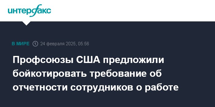 Москва. 24 февраля. INTERFAX.RU - Многочисленные американские учреждения и профсоюзы призвали федеральных служащих не отвечать на распространенное Управлением кадровой службы (ОРМ) электронное письмо с требованием отчитаться о своей работе за неделю, сообщает портал Axios.