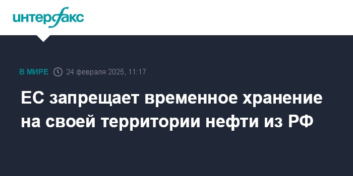 Москва. 24 февраля. INTERFAX.RU - Европейский союз в рамках 16-го пакета антироссийских санкций вводит запрет на хранение нефти и нефтепродуктов из РФ на своей территории, а также расширяет ограничения против перспективных проектов по добыче нефти и производству СПГ, говорится в заявлении ЕС.