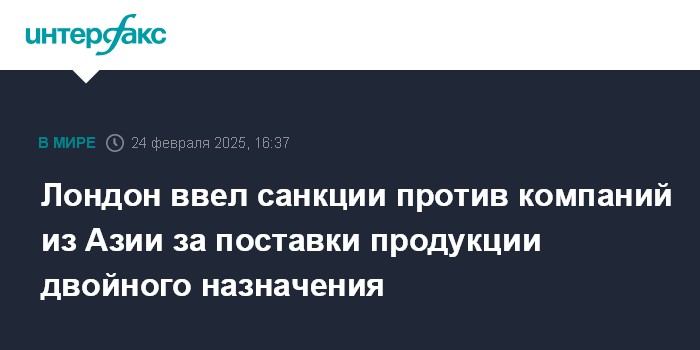 Москва. 24 февраля. INTERFAX.RU - Великобритания ввела санкции против ряда иностранных компаний за поставку продукции двойного назначения, оборудования и электроники для российских оборонных компаний.