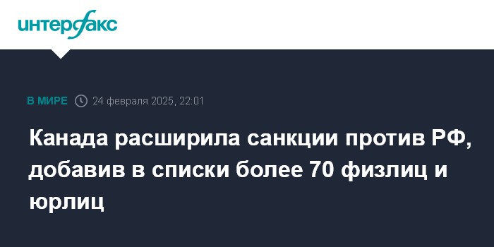 Москва. 24 февраля. INTERFAX.RU - Канадские власти в понедельник добавили в санкционные списки, связанные с Россией, более 70 физлиц и юрлиц, говорится на сайте правительства Канады.