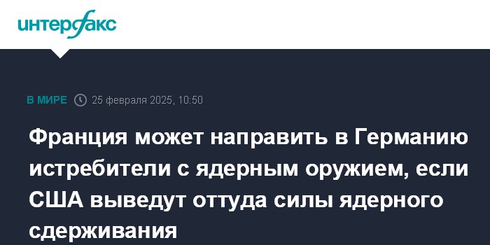 Москва. 25 февраля. INTERFAX.RU - Франция готова перебросить в Германию истребители с ядерным оружием в том случае, если силы ядерного сдерживания США покинут ФРГ, сообщает во вторник The Telegraph со ссылкой на источник.