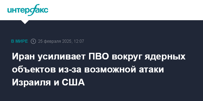 Москва. 25 февраля. INTERFAX.RU - Военные Ирана привели в состояние повышенной готовности системы ПВО у ядерных и ракетных объектов и развернули дополнительные средства противовоздушной обороны в связи с опасениями, что Израиль и США могут совершить атаку с воздуха, сообщает The Telegraph со ссылкой на источники.