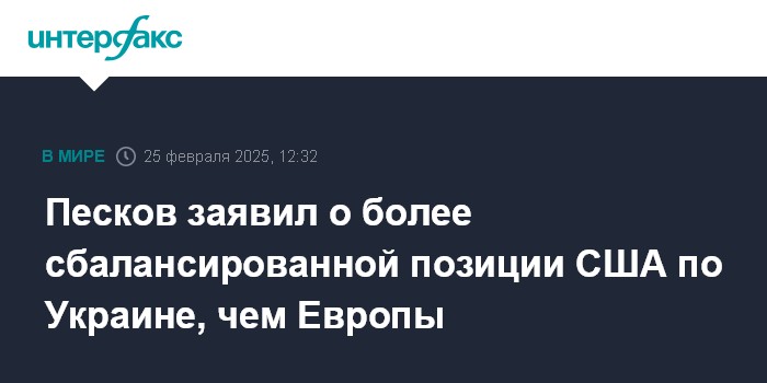 Москва. 25 февраля. INTERFAX.RU - США занимают на данный момент более сбалансированную позицию, направленную на урегулирование конфликта вокруг Украины, возможно после контактов Брюсселя и Вашингтона Европа тоже будет тяготеть к большему балансу в этом вопросе, заявил пресс-секретарь президента РФ Дмитрий Песков.