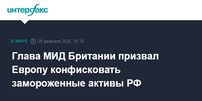 Москва. 25 февраля. INTERFAX.RU - Европе пора конфисковать блокированные ранее в ее юрисдикции российские активы, заявил во вторник в обращении к парламенту глава британского МИД Дэвид Лэмми.