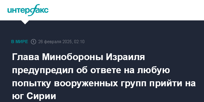 Москва. 26 февраля. INTERFAX.RU - Глава минобороны Израиля Исраэль Кац заявил, что армия обороны Израиля наносит удары по югу Сирии в рамках новой политики демилитаризации.