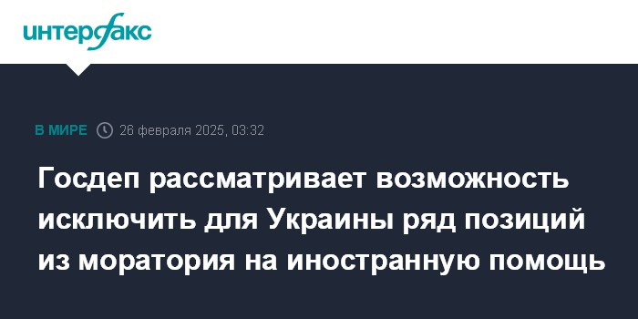 Москва. 26 февраля. INTERFAX.RU - В Госдепартаменте США составляется список исключений из моратория на иностранную помощь, которые могли бы обеспечить Украине приостановленную в настоящее время некоторую экономическую поддержку и поддержку в области безопасности, сообщила Politico, ссылаясь на источники.