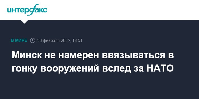 Москва. 26 февраля. INTERFAX.RU - Активная милитаризация НАТО представляет угрозу для Белоруссии, однако страна не намерена ввязываться в гонку вооружений, заявил в Женеве на заседании сегмента высокого уровня Конференции ООН по разоружению министр иностранных дел Белоруссии Максим Рыженков. Его цитирует пресс-служба МИД.
