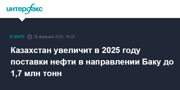 Казахстан увеличит в 2025 году поставки нефти в направлении Баку до 1,7 млн тонн