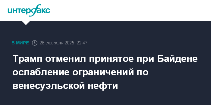 Москва. 26 февраля. INTERFAX.RU - Американский президент Дональд Трамп заявил об отмене "соглашения об уступках", касающегося венесуэльской нефти, так как Каракас не выполнил свою часть договоренностей и медленно принимает выдворяемых из Штатов нелегалов.