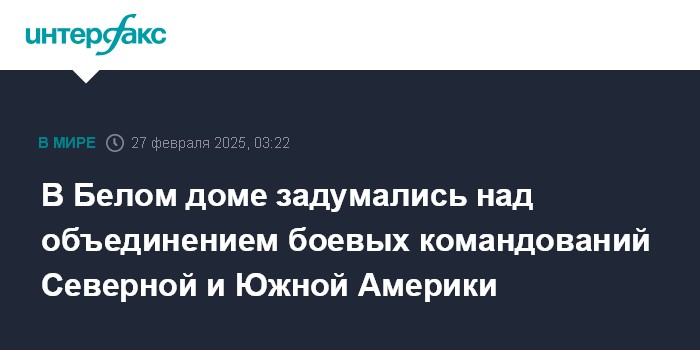 Москва. 27 февраля. INTERFAX.RU - Администрация президента США Дональда Трампа рассматривает возможность объединения двух боевых командований Минобороны, которые отвечают за Северную и Южную Америку, чтобы сократить расходы ведомства, сообщил телеканал NBC со ссылкой на американских чиновников.
