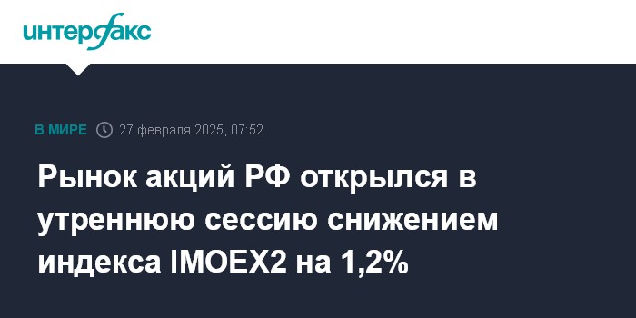 Рынок акций РФ открылся в утреннюю сессию снижением индекса IMOEX2 на 1,2%