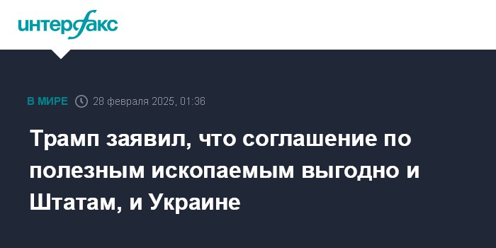 Москва. 28 февраля. INTERFAX.RU - Соглашение о добыче США полезных ископаемых на Украине поможет Вашингтону вернуть потраченные деньги, а Киеву - восстановиться после боевых действий, заявил американский президент Дональд Трамп.
