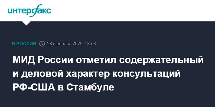 Москва. 28 февраля. INTERFAX.RU - Российско-американские консультации в Стамбуле прошли в содержательном ключе, стороны условились продолжить диалог по данному каналу, сообщили в пятницу в МИД РФ.