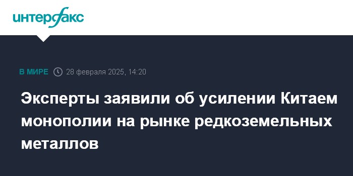 Москва. 28 февраля. INTERFAX.RU - Китай стремится усилить свою превалирующую роль на мировом рынке редкоземельных металлов (РЗМ), где в последние годы его доля производства товара составляет около 70%. Такие выводы сделаны в статье, опубликованной в журнале "Минеральные ресурсы России".