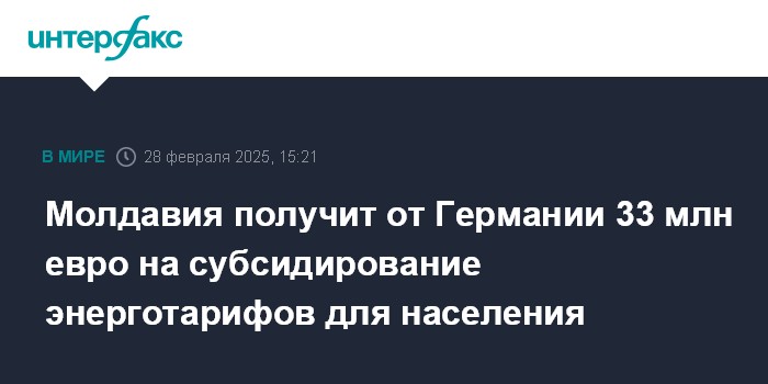 Москва. 28 февраля. INTERFAX.RU - Германия предоставит Молдавии грант в размере 33 млн евро, который будет использован для финансирования Фонда снижения энергетической уязвимости с целью прямой поддержки населения для преодоления последствий энергокризиса, сообщила посол Германии в Кишиневе Маргрет Юббер. Ее цитирует агентство Moldpres.