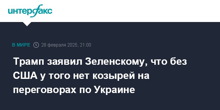 Москва. 28 февраля. INTERFAX.RU - Президент США Дональд Трамп назвал высказывания президента Украины Владимира Зеленского в Белом доме крайне неуважительными, отметив, что без Вашингтона у Киева нет козырей на переговорах с РФ.