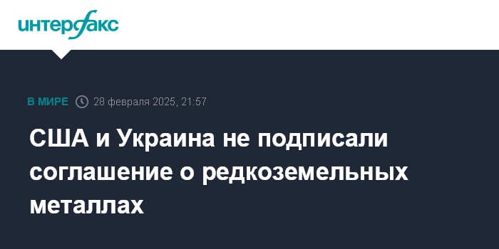 Москва. 28 февраля. INTERFAX.RU - США и Украина не подписали в пятницу соглашение об участии американской стороны в добыче полезных ископаемых на Украине, сообщает в пятницу Bloomberg.