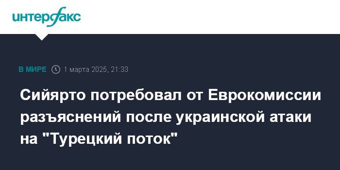 Москва. 1 марта. INTERFAX.RU - Глава МИД Венгрии Петер Сийярто в субботу заявил, что атака на объект газопровода "Турецкий поток" ставит под сомнение гарантии в сфере энергетической безопасности, которые Еврокомиссия дала Будапешту.