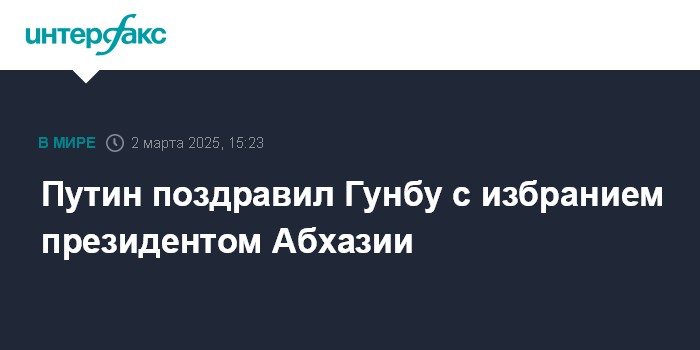 Москва. 2 марта. INTERFAX.RU - Президент России Владимир Путин поздравил Бадру Гунбу с избранием на пост президента Абхазии.