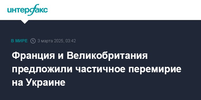 Москва. 3 марта. INTERFAX.RU - Франция и Великобритания выдвинули идею частичного перемирия между Россией и Украиной сроком на один месяц, которое не будет касаться наземных боевых действий, заявил французский президент Эммануэль Макрон.