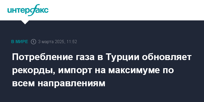 "Газпром" в своем комментарии в понедельник вечером также отмечает, что согласно расчетам на основе данных турецкой биржи EPIAS, в период ноября-февраля потребление газа в Турции было рекордным и превысило 30 млрд куб. м. В феврале был установлен абсолютный рекорд месячного потребления - более 8 млрд куб. м. Согласно заявлениям компании BOTAS, в феврале Турция также дважды обновила рекорд суточного потребления и достигла показателя в 333,7 млн куб. м газа.