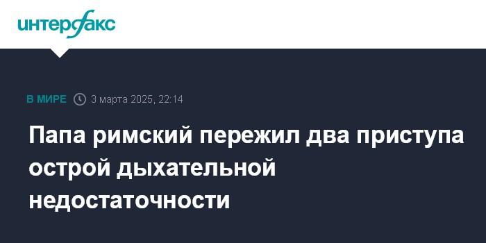 Москва. 3 марта. INTERFAX.RU - Значительное скопление слизи вызвало бронхоспазм и два приступа острой респираторной недостаточности у папы римского Франциска, находящегося на лечении в клинике, сообщает в понедельник Зал печати Святого престола.