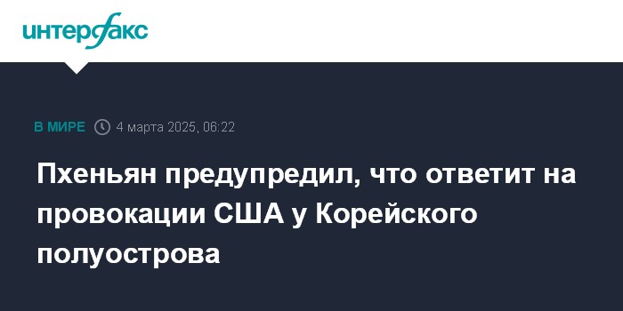 Москва. 4 марта. INTERFAX.RU - Пхеньян не намерен наблюдать за провокационной деятельностью США и их союзников в районе Корейского полуострова и намерен предпринять ответные меры, говорится в заявлении заместителя заведующего отделом ЦК Трудовой партии Кореи Ким Е Чжон.