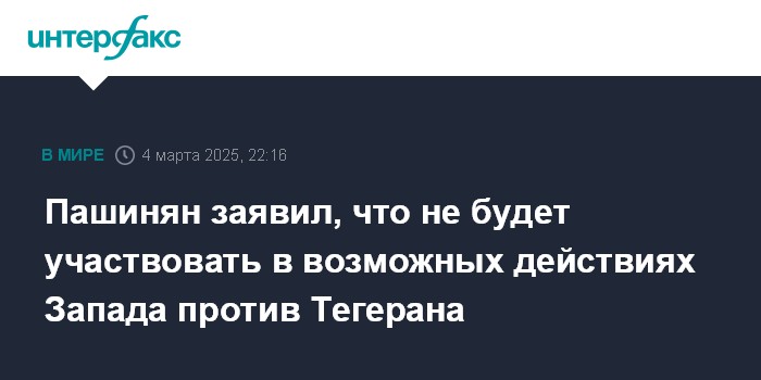 Москва. 4 марта. INTERFAX.RU - Армения не будет принимать участия в каких-либо действиях против Ирана, заявил премьер-министр Армении Никол Пашинян.