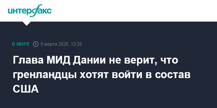 Москва. 5 марта. INTERFAX.RU - Министр иностранных дел Дании Ларс Лёкке Расмуссен выразил сомнение в том, что жители Гренландии хотят стать частью Соединенных Штатов.