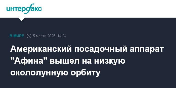 Москва. 5 марта. INTERFAX.RU - Космический аппарат Nova-C под названием Athena ("Афина"), выйдя на низкую окололунную орбиту, готовится к посадке. Об этом сообщила американская компания-разработчик Intuitive Machines.