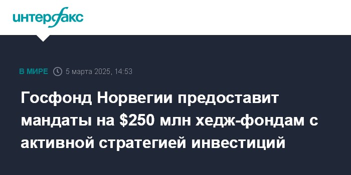Госфонд Норвегии предоставит мандаты на $250 млн хедж-фондам с активной стратегией инвестиций
