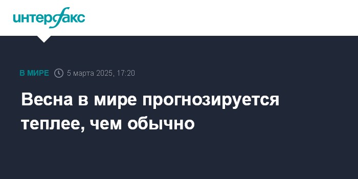 Москва. 5 марта. INTERFAX.RU - Весной во всем мире температура прогнозируется выше нормы, холоднее обычного она будет только в США и Канаде, в России также есть регионы, где температура весной будет около и ниже нормы, сообщил на пресс-конференции научный руководитель Гидрометцентра Роман Вильфанд, ссылаясь на согласованный прогноз мировых центров на весенний период.
