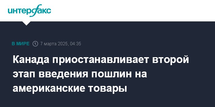 Москва. 7 марта. INTERFAX.RU - Канада приостанавливает ранее запланированный второй этап введения тарифов на более чем 4 тыс. видов товаров из США до 2 апреля, сообщил министр финансов Канады Доминик Леблан.