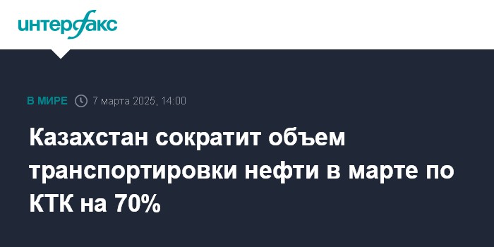 Москва. 7 марта. INTERFAX.RU - Казахстан планирует сократить объемы прокачки нефти в марте по системе Каспийского трубопроводного консорциума (КТК) на 70%, сообщил замминистра энергетики Алибек Жамауов.