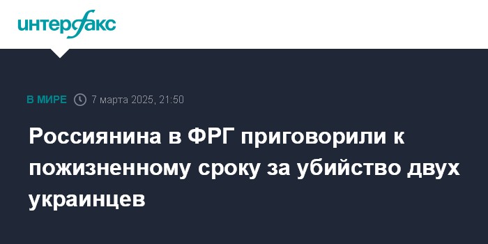 Москва. 7 марта. INTERFAX.RU - Россиянина в Германии приговорили к пожизненному заключению по обвинению в убийстве двух находившихся в стране на лечении украинских солдат после бытовой ссоры, сообщает в пятницу немецкий журнал Spiegel.