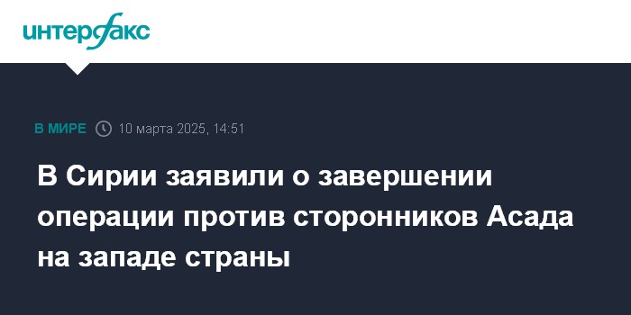 Москва. 10 марта. INTERFAX.RU - Лояльные Дамаску силы закончили военную операцию против сторонников экс-президента Сирии Башара Асада на западе страны, сообщает в понедельник "Аль-Арабийя" со ссылкой на Минобороны САР.