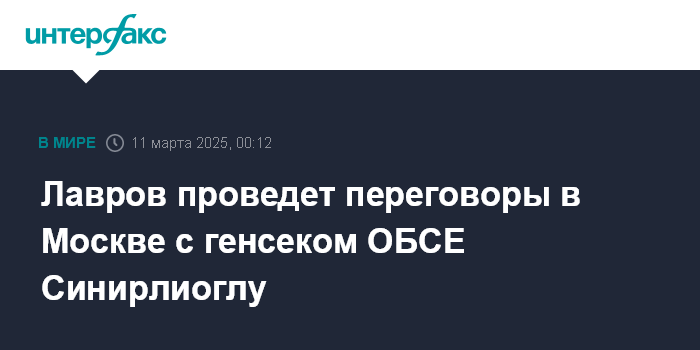 Москва. 11 марта. INTERFAX.RU - Глава МИД РФ Сергей Лавров 11 марта проведет переговоры с генсеком ОБСЕ Феридуном Синирлиоглу, сообщила официальный представитель российского внешнеполитического ведомства Мария Захарова.