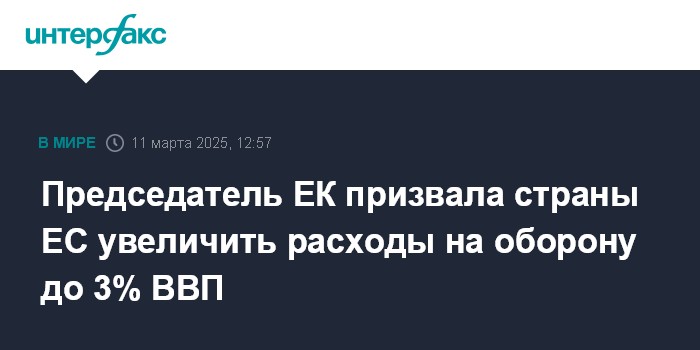 Москва. 11 марта. INTERFAX.RU - Председатель Еврокомиссии Урсула фон дер Ляйен призвала страны Евросоюза увеличить расходы на оборону до 3% ВВП.