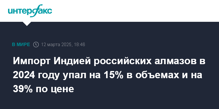 Суммарный импорт Индией алмазов в прошлом году был на 23% ниже данных 2023 года, составив 117,5 млн карат. Алмазная отрасль находится сейчас в затянувшемся кризисе, хотя российская "АЛРОСА" ожидает в ближайшие месяцы восстановления спроса и разворота цен на фоне нормализации запасов огранщиков.