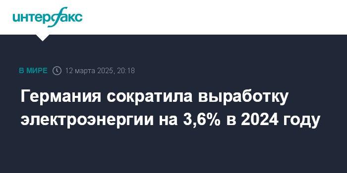 Москва. 12 марта. INTERFAX.RU - Общий объем выработки электроэнергии в Германии в 2024 году составил 431,5 млрд кВт.ч, что на 3,6% ниже показателя годом ранее, по предварительным данным статистического управления страны.