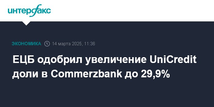 Москва. 14 марта. INTERFAX.RU - Крупнейший банк Италии UniCredit SpA получил одобрение Европейского центрального банка на увеличение доли в германском Commerzbank AG до 29,9%.