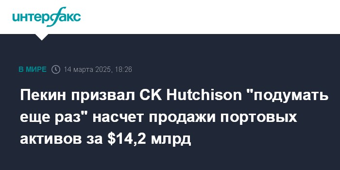 Москва. 14 марта. INTERFAX.RU - Власти Китая призывают гонконгский конгломерат CK Hutchison "подумать еще раз" насчет сделки по продаже портовых активов консорциуму с участием американской BlackRock, пишет Financial Times.