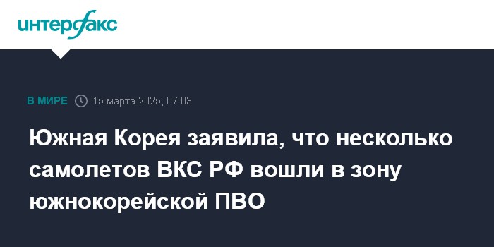Москва. 15 марта. INTERFAX.RU - По данным Объединенного комитета начальников штабов ВС Южной Кореи, несколько российских военных самолетов в субботу утром вошли в опознавательную зону южнокорейской системы ПВО в районе Восточного моря, сообщило агентство "Ренхап".