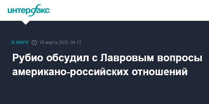 Москва. 16 марта. INTERFAX.RU - Госсекретарь США Марко Рубио и глава МИД РФ Сергей Лавров обсудили по телефону вопросы, касающиеся дальнейших действий, направленных на восстановление отношений между двумя странами, сообщил американский госдепартамент.