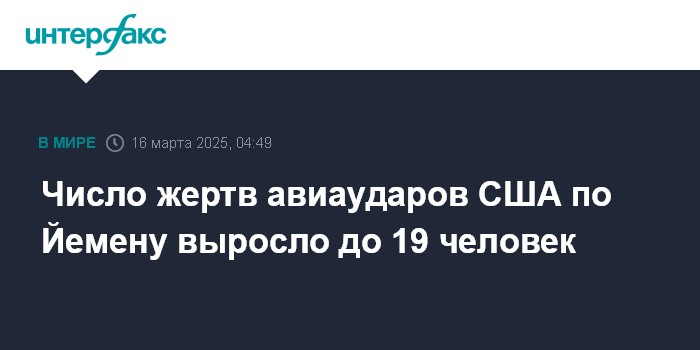 Москва. 16 марта. INTERFAX.RU - До 19 мирных жителей увеличилось число жертв авиаударов США по Йемену, сообщил минздрав йеменских хуситов.