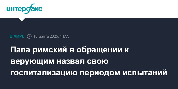 Москва. 16 марта. INTERFAX.RU - Продолжающий лечение в римской больнице "Агостино Джемелли" папа римский Франциск в воскресенье приветствовал последователей католической веры письменным посланием, в котором отметил, что переживает период испытаний.