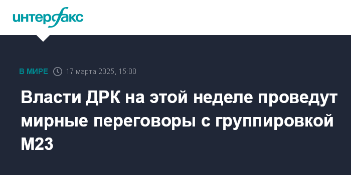Москва. 17 марта. INTERFAX.RU - Мирные переговоры между властями Демократической Республики Конго (ДРК) и поддерживаемой Руандой группировкой "Движение 23 марта" (М23) пройдут 18 марта в Анголе, сообщает Associated Press (AP).