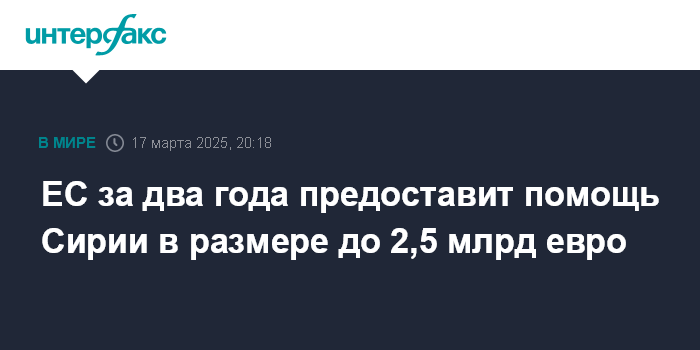 Москва. 17 марта. INTERFAX.RU - Председатель Еврокомиссии (ЕК) Урсула фон дер Ляйен заявила в Брюсселе в понедельник, что Евросоюз выделит на помощь Сирии около 2,5 млрд евро в 2025-2026 годах.